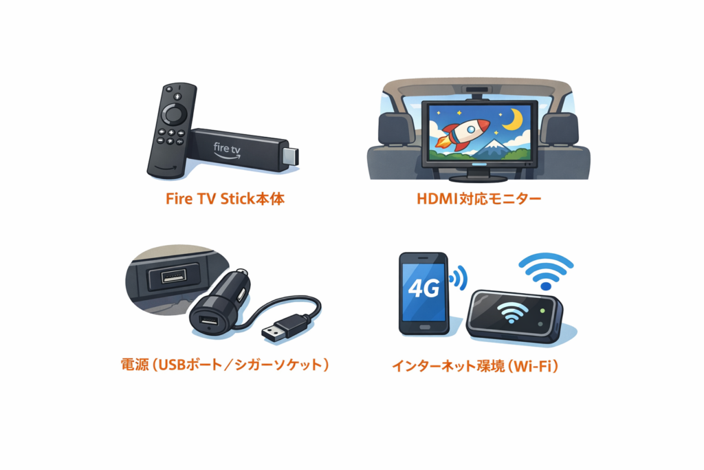車でファイヤースティックを使うために必要なものは、基本的に以下の4つです。