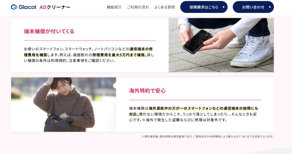 Glocal ADクリーナーには通信端末修理費用保険がついています。