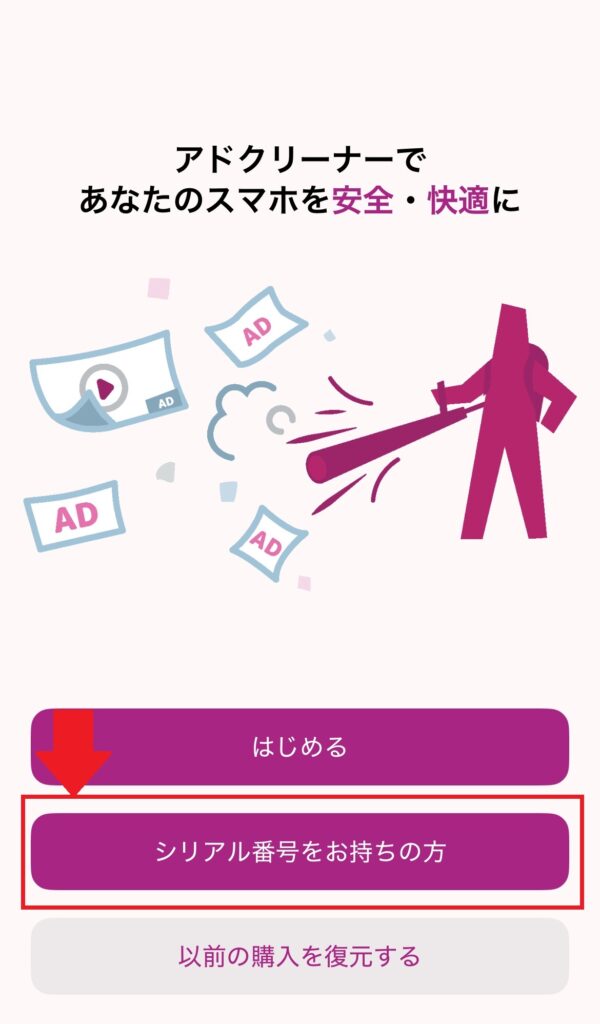 Glocal ADクリーナーをお申し込みの方にはメールで「シリアルコード」が発行されます。立ち上げたアプリの画面でシリアルコードを入力します。